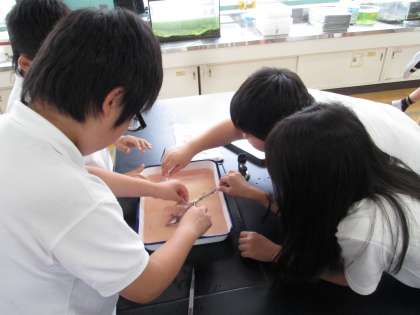 一時は騒然となった理科室でしたが、やがて解剖に熱中する子どもたちへと切り替わっていきました。中にはどうしてもアジの内臓をさわれない子もいましたが、予想以上に盛り上がりを見せた時間となりました。
