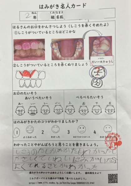 第一大臼歯はむし歯になりやすいこと、おやつは時間を決めて食べること、寝る前の歯みがきはとくに大切であることなどを学習しました。