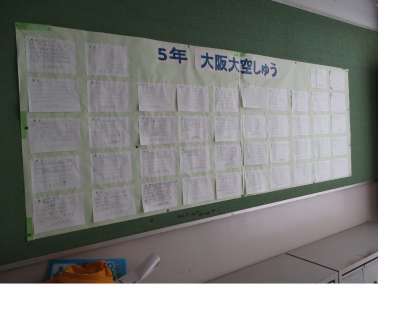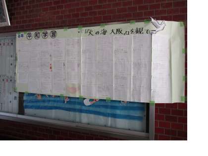 8月6日の全校集会の後、講堂に掲示していた子どもたちの平和学習の感想を、玄関、事務室前、職員室前に再度掲示しました。