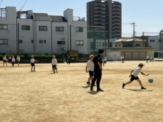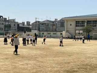 ダンゴムシを探す子、おにごっこやボール遊びをする子たちがいます。
