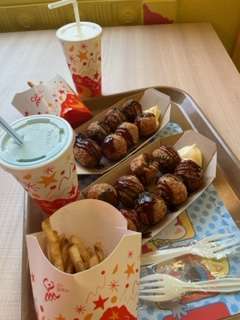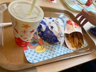 ?あいにくの雨のため、ご飯を先に食べたり室内の乗り物を楽しんだりしています。