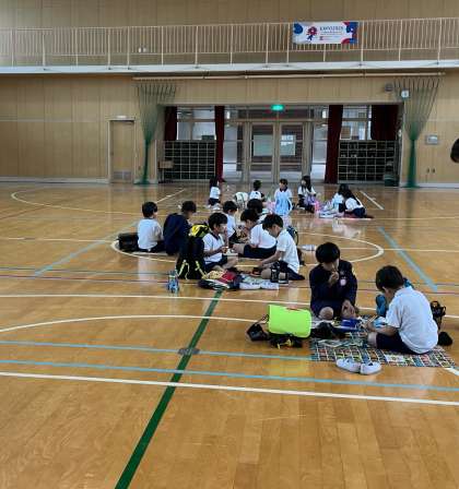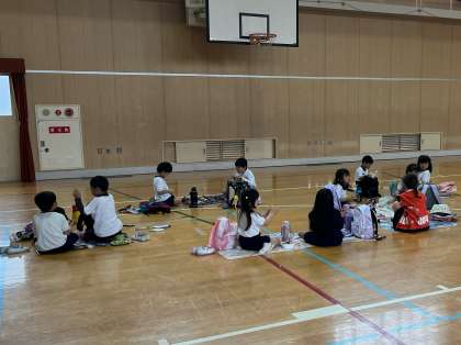 楽しみにしていた校外活動が、雨のため延期になりました。少しでも楽しめるように、お昼ご飯は、講堂でみんなで食べました!次回こそ、晴れ空の下食べられますように!
