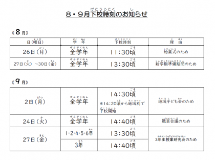 7月末時点での8・9月の下校時刻のおしらせです。ご予定ください。