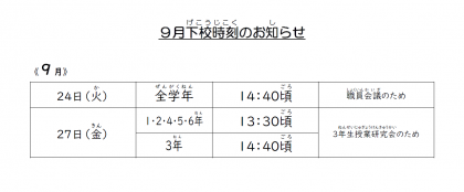 下校時刻変更について【再】 公開日 2024/09/13 更新日 2024/09/13 保護者のみなさまへ 先日もお伝えしておりますが、9月後半の下校時刻の変更のお知らせです。ご予定をお願いいたします。 いいね(0)