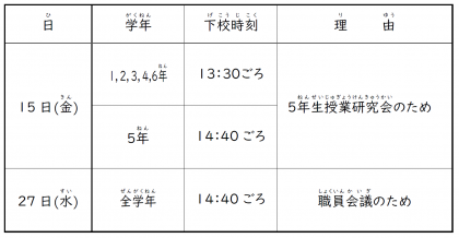 11月の下校時刻変更のお知らせです。ご確認ください。