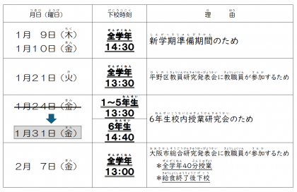 先日ホームページでお知らせしておりました、1月の下校時刻の変更のお知らせに訂正がありました。お手数をおかけして申し訳ありませんが、再度、ご確認をお願いいたします。