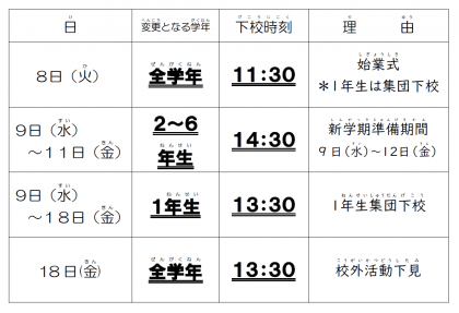 4月の下校時刻変更のお知らせです。ご確認ください。