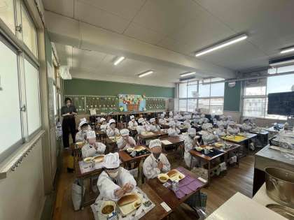 配膳は5年生のお兄さんお姉さんがお手伝いをしてくれました。「早く自分たちでやりたい!」と5年生の様子を一生懸命見ていました。