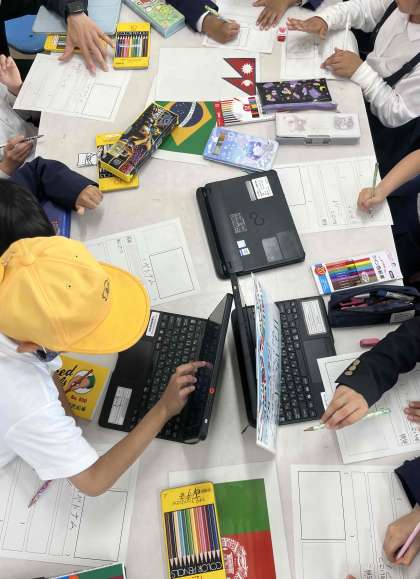 本年度初めてのワールドサークルがありました。様々な国々にルーツを持つ子どもたちが集まって、自分や友だちの国の言葉や文化などについて交流します。今回は、自己紹介の後、自己紹介カードに国旗やあいさつの仕方などをまとめました。