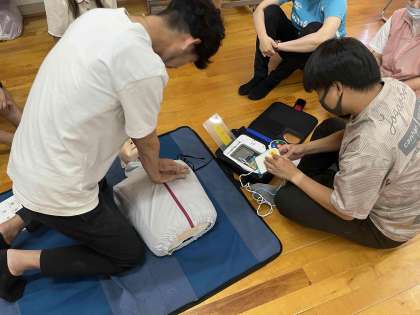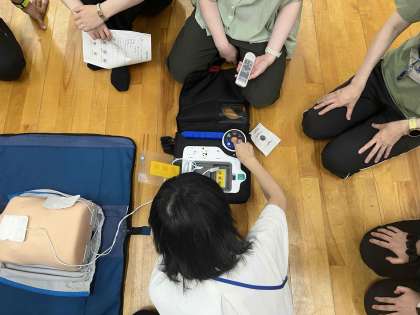 13日の放課後,救急救命講習がありました。応急手当の方法や胸骨圧迫、AEDの使い方など、消防署の協力のもと、教職員で研修を行いました。