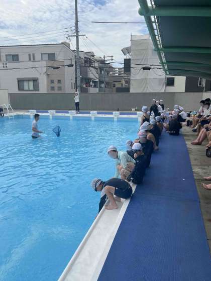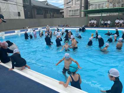 プール水泳が始まりました。1年生にとっては、初めてのプールでしたが、6年生がしっかりとサポートしてくれたおかげで、みんな笑顔でプールに入ることができました。