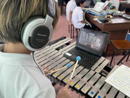 音楽では合奏のパート練習やリコーダーの練習、楽譜の共有などに活用しています。ヘッドホンをつけて自分の楽器の動画に合わせて演奏したり見返しながら練習をしています。