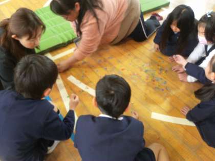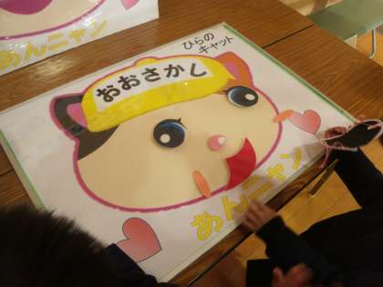 おはじき、あやとり、だるま落とし、ふくわらい、こままわし、はねつきなどなど・・・たくさんの昔懐かしい遊びを、地域の方々に教わりながら楽しく班でまわります。
