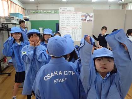 また、最後は職員の方がいつも着用している作業着や手袋などを試着させてもらい、「手袋が分厚い!」「この靴めちゃ重い〜!毎日これを着てお仕事するの大変やな・・。」と、子どもたちは実際に働いている方々の苦労も実感していました。