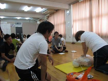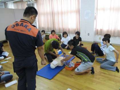 例年通り、平野消防署救急隊をお招きし、AEDの使用方法を含む心肺蘇生法を学びました。