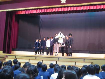 本校が文楽劇場となった日・・・。今年度、幸運にも「大阪市 小中学生のための芸術体験授業」に当選し、1月29日(水)の3時限目と4時限目に本校講堂において人形浄瑠璃の公演がありました。