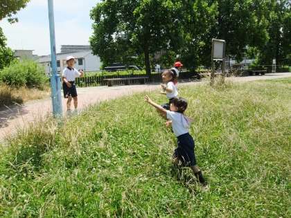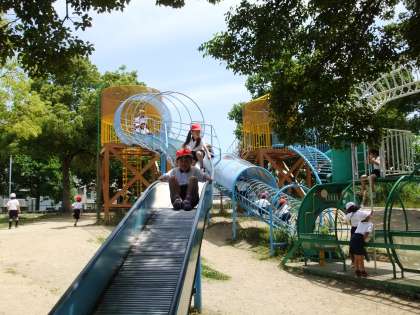 シロツメグサで指輪や首飾りを作ったり、モンシロチョウを追いかけたりして遊ぶ姿が見られました。大きな遊具でも遊び、大きなローラーすべり台や、うんていなどで楽しく遊ぶことができました。