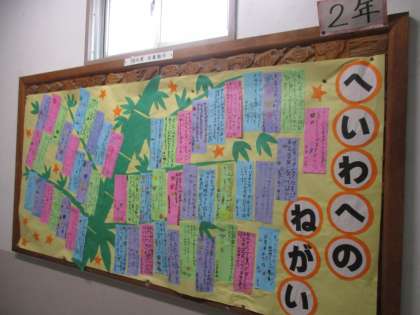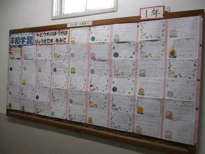 それぞれの学年が実施した平和に関する授業(平和教育)の感想文を階段掲示しています。ひとりひとりの子どもたちが、平和についてどんな思いをもっているのか、来校の折には、ぜひご覧いただきたいと思います。