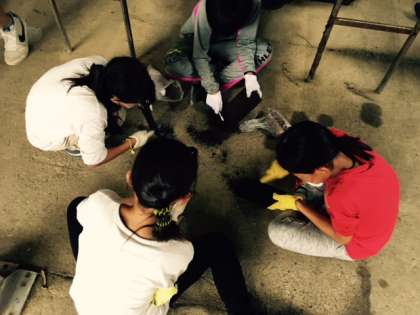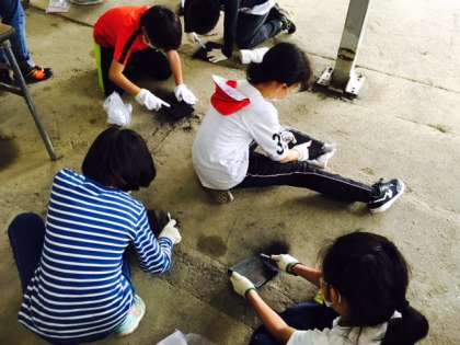 焼かれた板を古タオルと古歯ブラシで磨きます!!