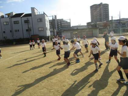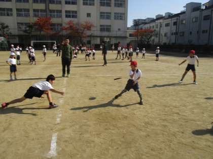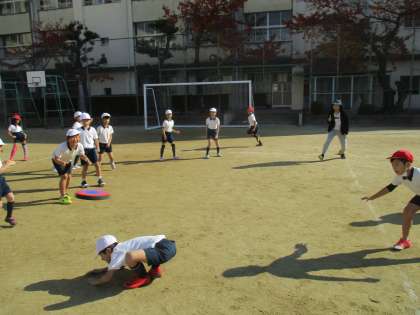 太陽の日差しが心地よい中、ペア学年合同のドッジビー大会を行いました。なかなか自分の思うようには飛ばない円盤に翻弄されながらも、歓声を上げる子どもたちでした。