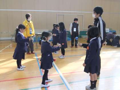 地域の方々に来ていただき、こま回しや、けん玉、羽子板などを教えていただきました。