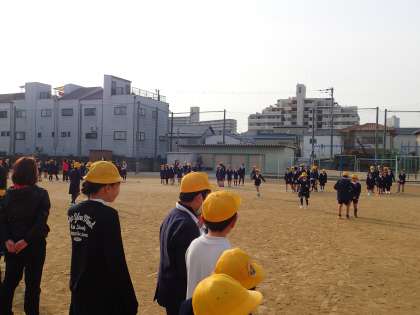 各班1人が走り出し、向か合った班の人とぶつかったところで、両手で「どん!」をして、じゃんけんをします。勝てばそのまま進み、負ければ自分の班の一番後ろに戻り、2番手が走り出します。相手の班のところまでたどり着けば勝ちです。