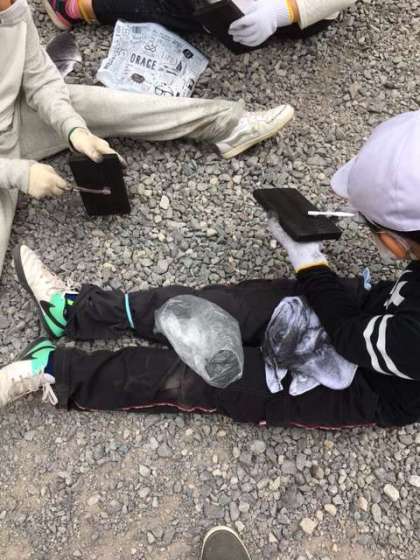 焼き板作りが始まりました。 まずは古タオルで表面をこすります。