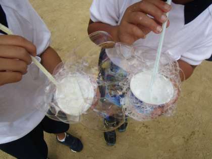 お天気の良い日に、しゃぼんだまの液とストローを持ち、運動場でたくさんのしゃぼんだまを作って遊びました。
