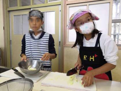 栄養のバランスについて学習し、調理の計画を立てて「ジャーマンポテト「コンソメスープ」」を作りました。
