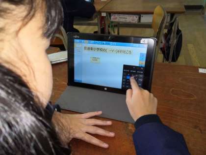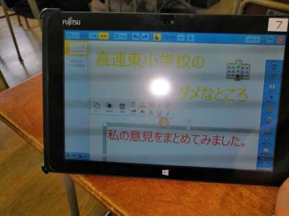 タブレットを使い、学校の良い所や改善点などをプレゼンします。他校との比較を行い、学校をより良くするためにはどうすればよいのか、を考えながら資料を作っています。