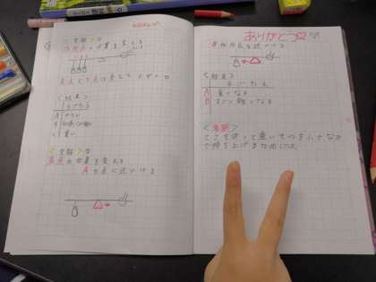 今日は、てこをどう使えば重いものを持ち上げられるかを実際に体験して調べています。