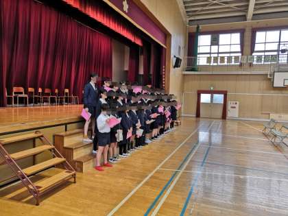 呼びかけ、入場の仕方を練習しています。子ども達は本番さながらの表情で、集中して練習に取り組んでいました。