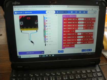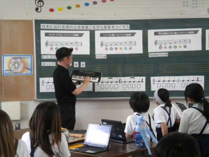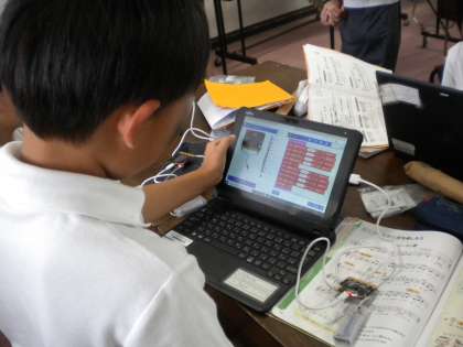 4年生の音楽では、「日本に伝わる曲のよさを感じながら音楽をつくろう」に取り組んでいます。日本に伝わる曲の音階を使って、マイクロビットにプログラミングし、友だちと組み合わせて音楽をつくりました。