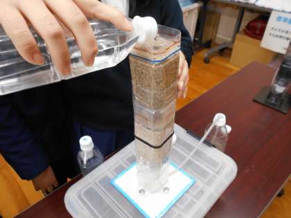 小さい装置で実際にろ過体験をしたり、ミネラルウォーターと水道水の飲み比べクイズをしたりして過ごしました。