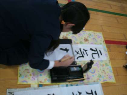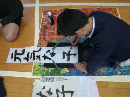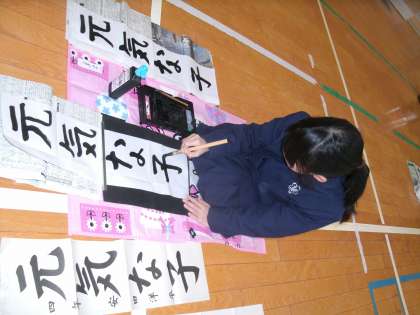 さて、新年の行事といえば書き初めですよね。4年生は「元気な子」という字を書きました。4年生みんなで一緒に書きました。普段は椅子に座って書きますが、今回は床に座って書きます。慣れない書き方で難しそうでしたが、大きな字で書いた「元気な子」には、みんなのパワーがこもっていて素晴らしい作品になりました。今年も元気いっぱいで過ごせそうです!(*^_^*)