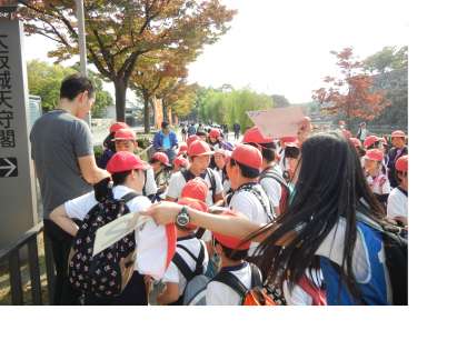 折しも大坂夏の陣から400年ということで、公園内は大賑わい。西の丸庭園も例外ではありませんでしたが、子どもたちは大阪城を見上げながらお弁当を食べたり、たて割り班で遊んだり、大いに楽しんでいました。 -
