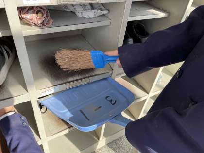 班で掃除する場所を決め、手作り掃除グッズを作った班も。