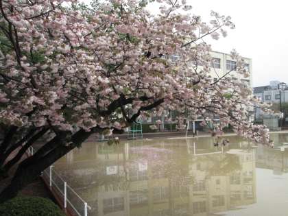 先日の大雨で校庭の八重桜は殆ど散ってしまいましたが、水面に浮かぶ桜の花びらがとても美しく、まるで奈良公園・鷺池の浮見堂を思わせるような光景でした。 -
