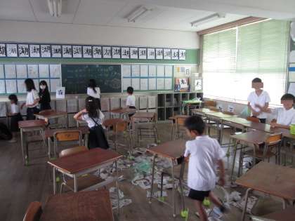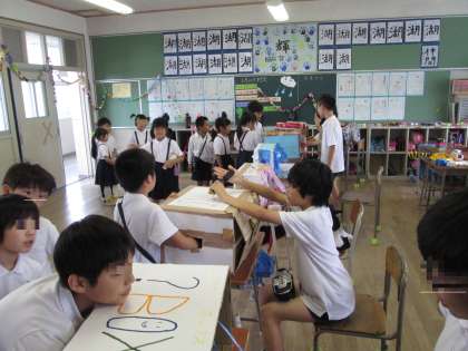 1年生は前半後半ともコーナーめぐりです。たて割り班リーダーの6年生は、しっかりと班のメンバーを仕切っていました。