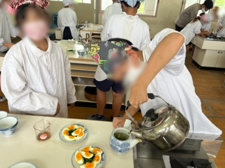 初めての調理実習で、ゆで卵とほうれん草のおひたしを作りました。