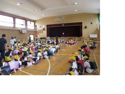 1・2年生は火災時の煙を疑似的に体験できるテントを使って、煙の恐ろしさ体感しました。3・4年生は水消火器による消火体験を行い、5・6年生は防火啓発のアニメを見た後、防災に関するクイズを行いました。 -