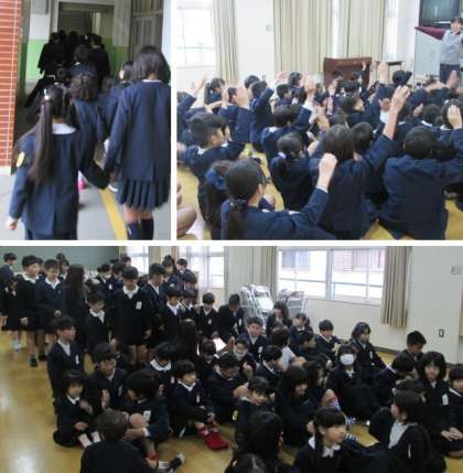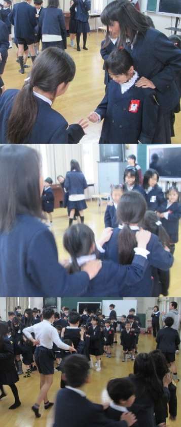 1年生の学級で自己紹介等をした後、手をつないで多目的室へと。「すわりや。」「先生の話聞こうな。」やさしく声かけをしている6年生。その後、じゃんけん列車です。じゃんけんをして、負けたら勝った人の列の後ろについていくという分かりやすいゲーム。全員で楽しく活動しました。