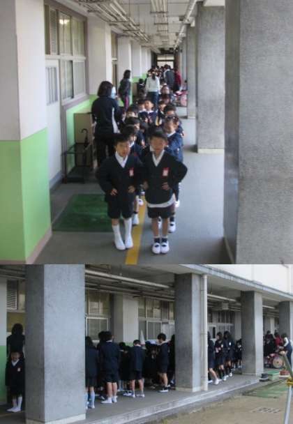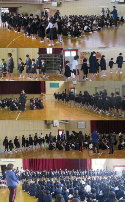 教室前で並んでいると、6年生が迎えに来てくれました。2〜5年生が拍手で迎える中、6年生と一緒に手をつないで元気に入場し、整列しました。