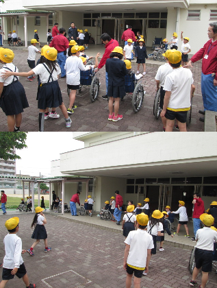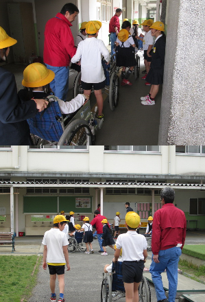 そして、いよいよ講堂の外に出て、校内を車いすで移動します。車いすに乗る役、車いすを押す役(介助体験)に分かれて、正門付近のゴールを目指します。車いすを押す人は、乗っている人に声をかけることの大切さに気付きました。また、乗っている人にとって段差やスロープの昇り降りが怖いと感じることもわかりました。