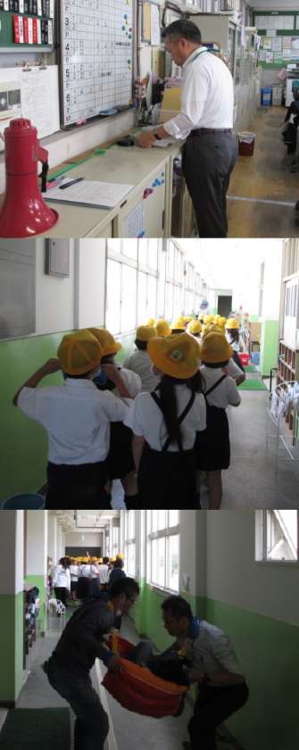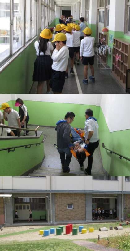非常ベルの後、校長先生の放送があり、各学級から先生の指示で避難します。煙を吸わないようにハンカチを用意。今年も車椅子が使えないときのことを想定し、簡易担架を使用しました。