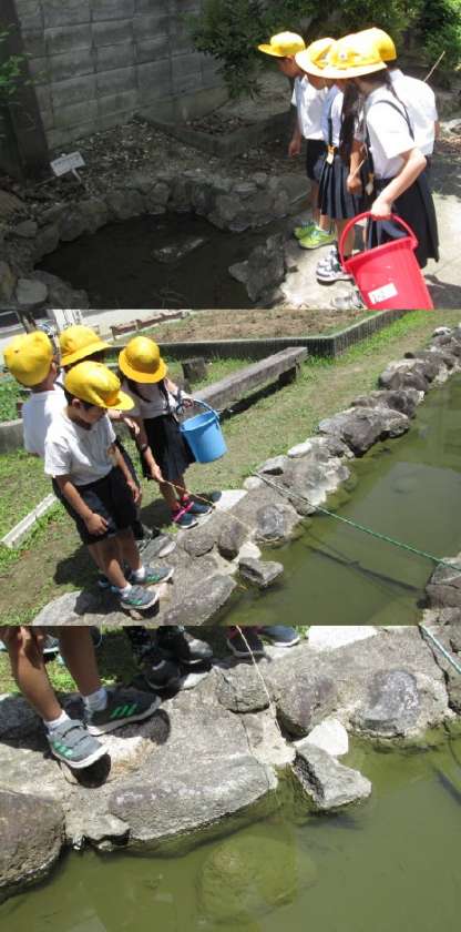 校舎南側の学習園横の小さな川に、メダカやザリガニが住んでいます。今日3時間目、2年生は生活科の学習で、ザリガニ釣りをすることに。糸の先にさきいかをくくりつけ、そうっと川の中にたらします。「そこにおる!」「ゆっくり!!」釣る人も見守る人も一生懸命です。