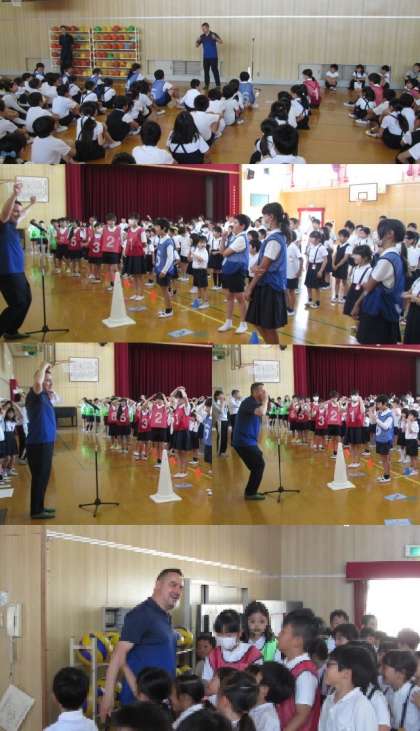 次に、今年度来ていただくC-NETのMark Richardsonさんが紹介されました。「How are you?」「Fine!」早速、元気なやりとりです。「Head!」「Nose!」楽しくジェスチャーも!退場の時には、皆に囲まれてました!!