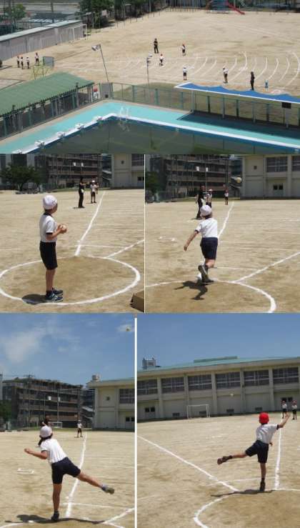 先生方で引いた白線を使って、ソフトボール投げが行われました。円からはみ出ないように「ヤーッ!」。一人2回投げます。