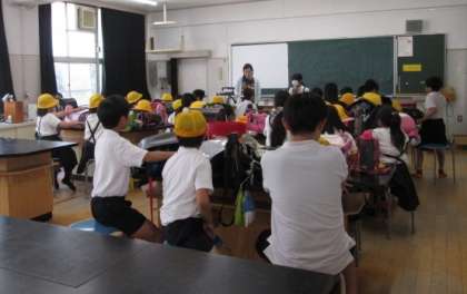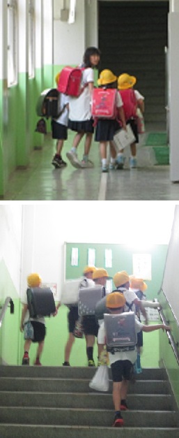 各学級で事前指導を受けた後、集団下校するために、地域子ども会の教室へ移動します。各班の班長さんが、1年生を迎えに行ってくれました。