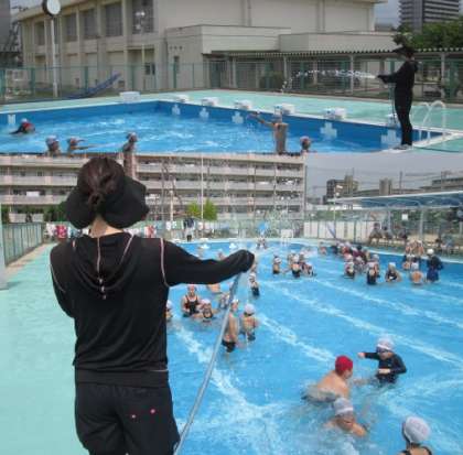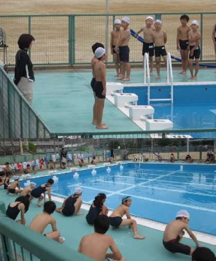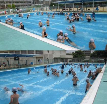 いよいよ今日は「プール開き」。2学年ずつペアを組んで、楽しく実施しました。